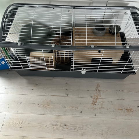 Stort bur til kaniner, voliere, med indgangsdør, lås og lukket i top, måler bredde: 160cm, højde: 162 cm, længde: 258 cm, tern måler 2,5x2,5 cm. Udstyr følger med efter aftale. (Indretning, varmelampe, lille bur, drikkeflasker og skål).
