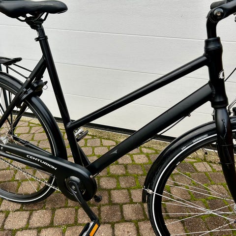 Centurion Genesis hybridcykel til kvinde med 54 cm stel og 28"/700c hjul. Cyklen er lige blevet opgraderet med nyt bagdæk, ny kæde og ny gearskifter. Cyklen har et klassisk dame-/unisexstel med lavere indstigning og er velegnet til både by- og hverdagscykling. Udstyret omfatter bl.a. bagagebærer, støtteben og dæk til kørsel på asfalt og let grus. Farven fremstår som mørk (sort). Cyklen er egnet til pendling og almindelig transport i hverdagen.
