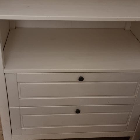 IKEA Hemnes brugt som puslebord med tilskåret Hoppekids Simon pusleplade (nypris 650 kr.), malet i farven “Humble Yellow” fra Jotun og med greb fra Søstrene Grene
