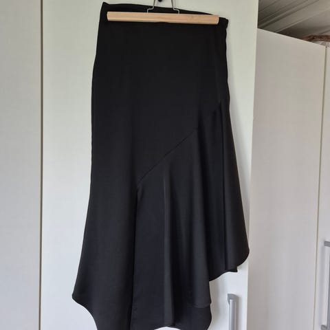Asymmetrisk nederdel, turkisblå i satin-agtigt stof fra Asos (dog ikke i mørket Asos) i en lille str. 36 - næsten ikke brugt.