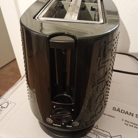 Brødrister fra Køkkenchef. Den er tydeligt brugt, rengjort så godt som muligt og fungerer helt tiptop!