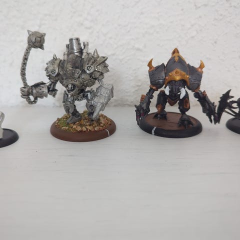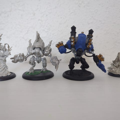 Samling af tabletop miniaturer bestående af flere forskellige figurer på individuelle baser. Figurerne forestiller blandt andet robotlignende kampmaskiner og krigere med våben og bannere. Miniaturerne er malede i forskellige farver, blandt andet rød, sort, grå og metalfarver, og står på runde baser med forskellige typer basing. Egnet til brug i diverse tabletop- og figurspil eller som samleobjekter og udstillingsfigurer.