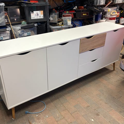 Skænk i hvid med topplade i eg-laminat. 2 låger og 3 skuffer.
