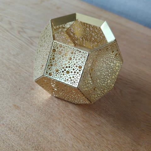 Tom Dixon lysestage i metal i gylden farve. Geometrisk form med gennemgående perforeret mønster i siderne, der giver et dekorativt lysmønster. Velegnet til placering på vindueskarm, bord eller hylde som stemningslys og dekoration i hjemmet.