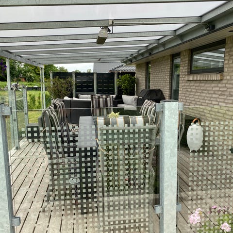 Glasrækværk til terrasse med metalstolper. Rækværket består af glasfelter monteret i lodrette stolper og en overligger i træ.Velegnet til afskærmning omkring terrasse eller altan i haven. Farver og præcise mål fremgår ikke af billederne og bør afklares ved interesse.