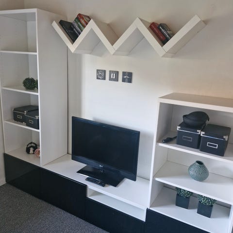 Reol med skab i ok stand. Trænger til kærlighed men så får du også et fint stykke møbel. Reolen fejler ikke noget bortset fra skrammerne.