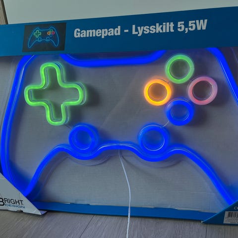 Bright Design neonskilt formet som en gamepad. Skiltet har flerfarvet LED-neonlys med kontur i blå og knapper i forskellige farver. Mål: højde ca. 40 cm og bredde ca. 60 cm. Velegnet som vægdekoration i gamer-værelse eller opholdsrum.