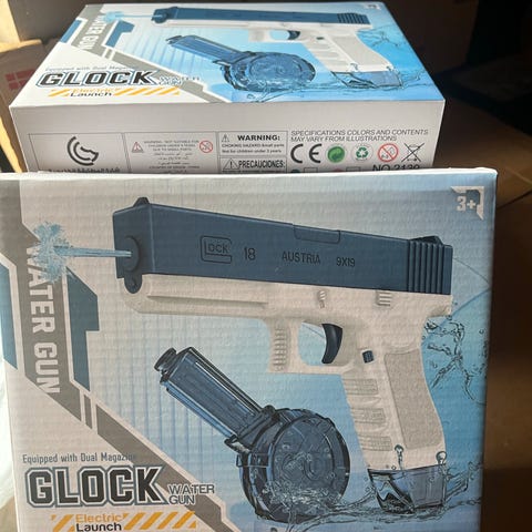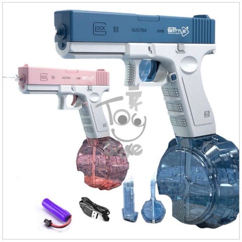 Glock vandpistol med elektrisk affyring. Modellen er udformet som en pistol og leveres med dobbelt magasin. Vandpistolen har elektrisk injektion, øget kapacitet, lækageforsegling og lang rækkevidde. Egnet som udendørs legetøj til børn fra 3 år og opefter under opsyn af en voksen.