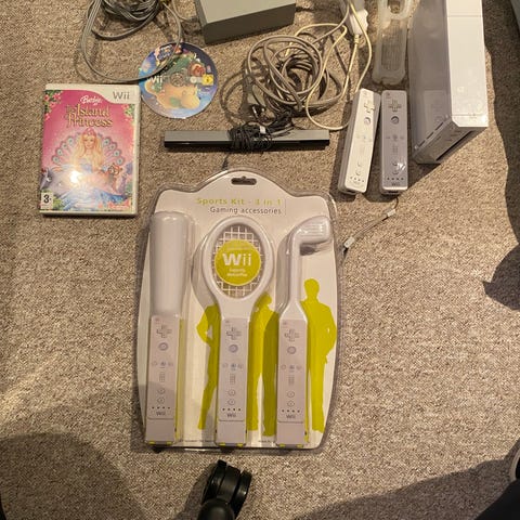 Nintendo Wii Mini konsol i rød/sort med tilhørende rød Wii Remote med indbygget motion censor (eftertragtet) og rød Nunchuk. Medfølgende kabler omfatter strømforsyning, AV-kabel og sensorbar. Sættet indeholder desuden spillet Mario Kart Wii med original æske, manual og hvidt rat-tilbehør til Wii Remote. Velegnet til lokal multiplayer-spil og bevægelsesbaserede spiloplevelser i stuen.