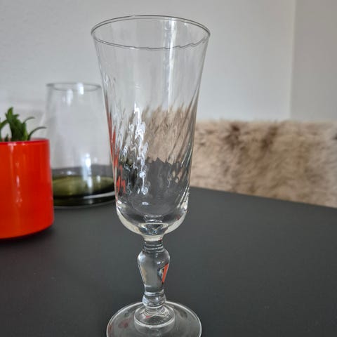 7 smukke Luminarc rosaline swirl champagneglas i klart glas. 16.5 cm høje.