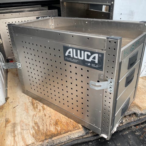 Aluca reolsystem til varebil i metal. Systemet består af modulopbyggede hylder, skuffer og sidepaneler med perforering til montering af tilbehør. Konstruktionen er i metal med flere åbne hylder og lukkede skuffer samt sideplader med huller til ophæng. Egnet til indretning af varebil eller værkstedsbil til opbevaring og organisering af værktøj og materialer.