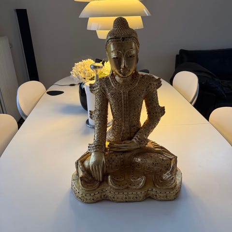 Buddha figur dekorationsfigur i sølvfarvet og brunmalet finish. Figuren forestiller en siddende Buddha med hænderne hvilende foran kroppen. Overfladen har et patineret, slidt udtryk med synlige malingsafskalninger, som giver et rustikt look. Velegnet som pyntegenstand i hjemmet, fx på hylde, reol eller bord. Materialet fremstår som hårdt og massivt, muligvis støbemateriale/kunststof eller lignende.