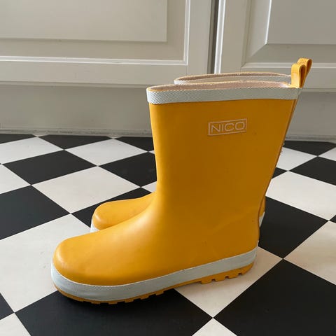 Nico gummistøvler til børn, unisex model i str. 35. Støvlerne er i mørkeblå gummi med lysegrønne detaljer og snørelukning foran. Mellemhøjt skaft med trækstrop bagpå og mønstret ydersål i gummi for bedre fodfæste. Velegnet som praktisk fodtøj i vådt vejr til både piger og drenge.