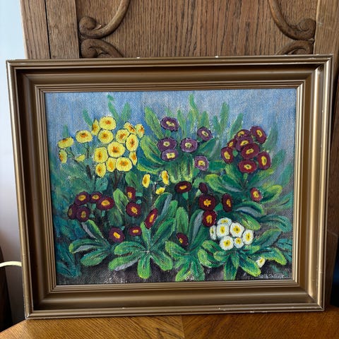 Oliemaleri blomster, ramme i fyrretræ, 120cm Høj x 100cm bred.