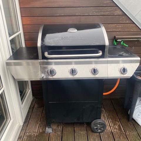 Nexgrill Daytona gasgrill med plancha-stålplade og tre brændere. Grillen har låg, frontpanel i metal med tre reguleringsknapper samt understel med hylde. Tilsluttes gasflaske via medfølgende gasslange og regulator som vist på billederne. Velegnet til madlavning på plancha-flade udendørs. Under halv pris