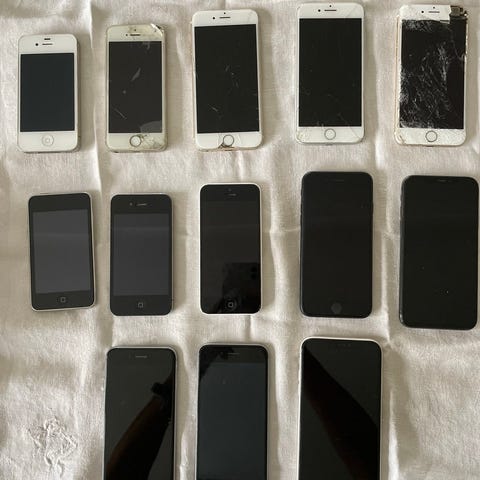Apple iPhone 2G-11 mobiltelefoner i blandede modeller. Flere forskellige iPhone-generationer ses på billedet, herunder både ældre og nyere modeller i forskellige størrelser og farver. Nogle af telefonerne har synlige skader på skærm eller kabinet, mens andre fremstår uden tydelige skader på billedet. Egnede til reservedele, reparation eller som projekttelefoner afhængigt af deres faktiske stand og funktion, som bør kontrolleres nærmere ved køb.