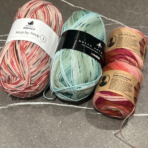 Strømpegarn i forskellige farver og kvaliteter klar til nye flotte sokker.