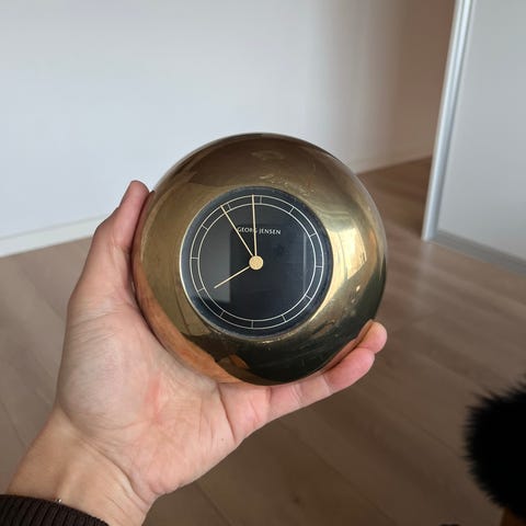 Georg Jensen rundt vægur i sort kabinet med hvid urskive. Uret har minimalistisk design med prikmarkeringer for timerne og tre visere. Bagpå ses batteridrevet urværk. Velegnet som bord- eller vægur i hjem eller på kontor.