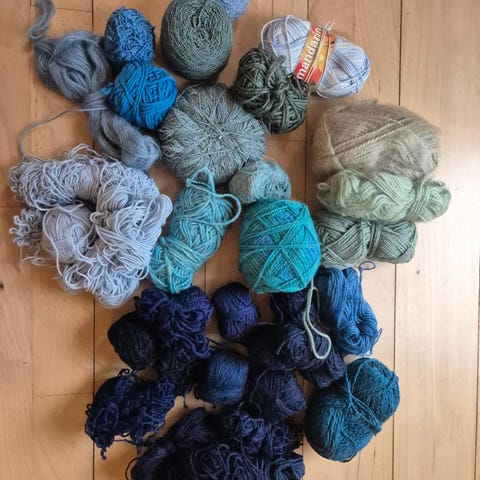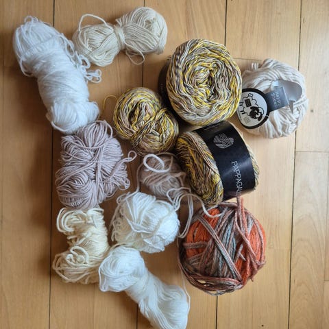 Blandet uld rester i forskellige rosa, lyserøde og røde nuancer. Samlet vægt 461g.