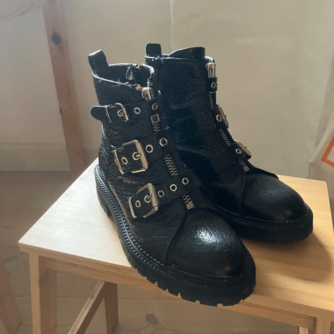 Billi Bi støvler i størrelse 40. Ankelhøje støvler i sort med præget mønster og lynlås i siden. Flad hæl og rund snude. Velegnet til hverdagsbrug og overgangssæsoner.