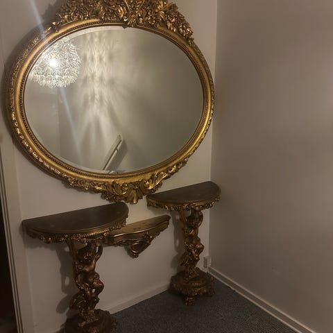 Oval vægspejl og tilhørende konsolbord i guldfarvet finish. Spejlet har dekoreret ramme med udskæringer, og konsolbordet er halvrundt med matchende detaljer. Sættet er egnet til ophæng på væg i fx entré, stue eller soveværelse som praktisk spejl og lille afsætningsplads.