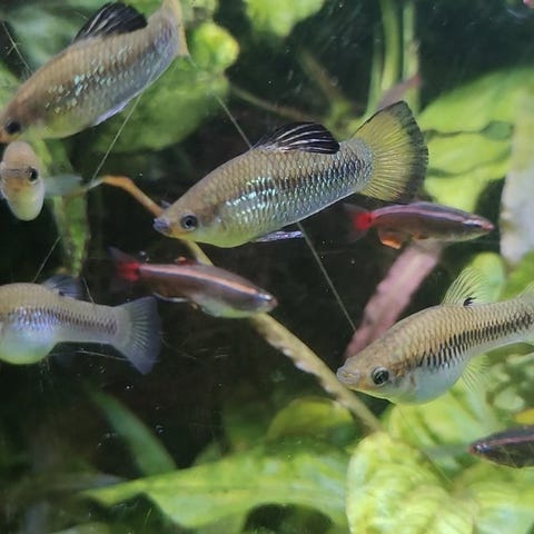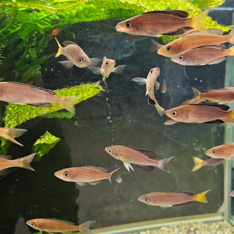 Sælger en næsten udfarvet flok ungfisk op til 8 cm. Et par mindre
