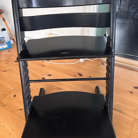 Stokke Tripp Trapp højstol i blå. Klassisk træhøjstol med justerbar siddeplade og fodplade, så stolen kan tilpasses barnets højde. Inkluderer bøjle, rygstøtte og rem foran. Velegnet som spise- og siddeplads ved bordet for småbørn og større børn. Farven er en klar turkisblå tone, og der ses almindelig brugsslid på kanter og hjørner.