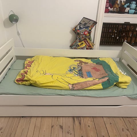 Har ganske få mærker som ses på billedet ellers fejler sengen ikke noget. Der er ingen madras til.