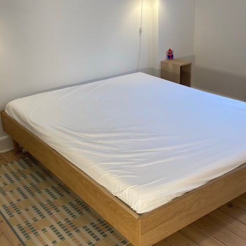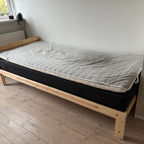 Der kan medfølge madras, som dog ikke er lige så ny som sengen, men hvis betrækkes vaskes er den også fin.