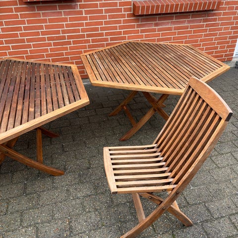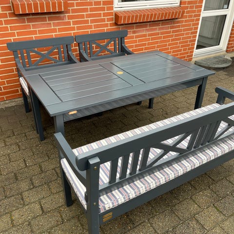 Sættet består af 2 stole, bord 85x155cm, samt 2 bænke 156 og 120cm.