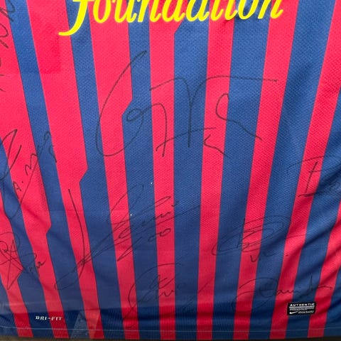 Trøjen er indrammet i træramme i guld, som måler 95 x 87 cm. Trøje og indraming har præcis samme mål, og hænger flot sammen med en anden Barcatrøje, signeret af Messi, Guardiola, Xavi, Iniesta, Pique, Alves, Pedro og Valdes, som jeg også har til salg: