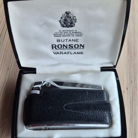 Ronson Varaflame Electronic lighter i metal. Lighteren er butandrevet og batteridrevet elektronisk tænding, som angivet i æsken. Designet er i metallisk finish med indgraveret/trykt tekst på fronten. Leveres i original æske, og der medfølger etui samt batteri som vist på billederne. Egnet til almindelig brug som lommelighter.