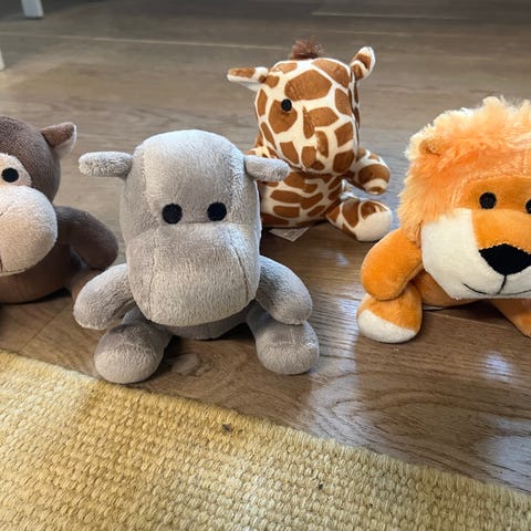Kæmpe plysdyr sæt med flere store bamser i forskellige dyremotiver. Sættet omfatter blandt andet en stor grå elefant, en stor grøn krokodille med mørk kam, en lysebrun bjørnebamse, en lyserød enhjørning samt en stor panda i sort og hvid. Alle bamserne er bløde plysdyr, velegnede som lege- eller krammedyr og som dekorative figurer på børneværelset eller i legehjørnet.