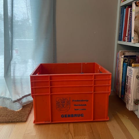 æblekasse der er blevet malet og fået hjul på og er blevet brugt til opbevaringskasse.