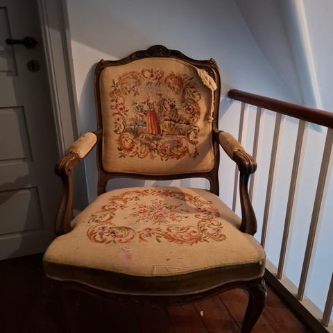 God siddekomfort. Broderi på sæde og ryg. Siddehøjde er 47 cm og stol bredde 57 cm.