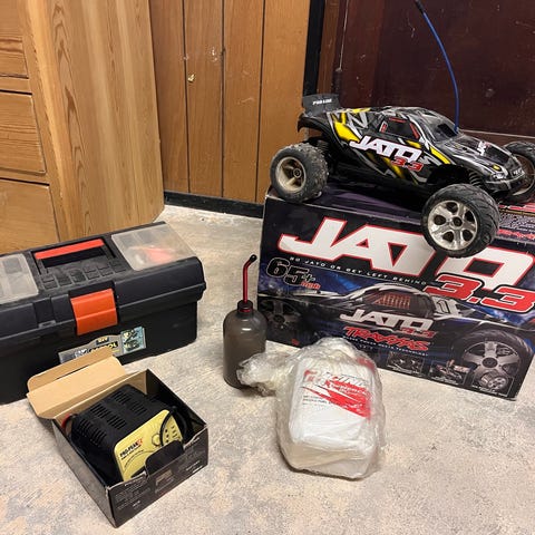 Traxxas Rustler fjernstyret bil. Modellen er en elektrisk RC-bil med terrængående dæk og karrosseri i flerfarvet design. Bilen er egnet til kørsel på faste underlag og let terræn. På billederne ses slid og revner på mindst ét af dækkene, hvilket kan kræve udskiftning. Velegnet til hobbybrugere, der ønsker en robust fjernstyret bil til leg og kørsel udendørs eller i større indendørs områder. 2 stk. de har ikke kørt ret meget. Men har stået stille længe, skal derfor have udskiftet nogle dæk. Pris er for 2 stk.