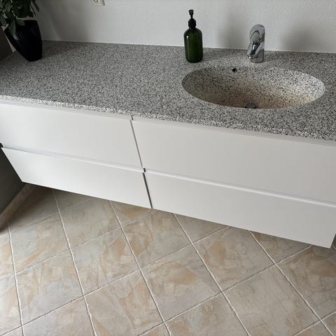 KVIK badeværelsesmøbel med integreret vask og væghængt skab i mørkbejdset egetræ. Bordpladen er i terrazzo look med nedstøbt rektangulær vask og centreret afløb. Armatur og afløb medfølger ikke.