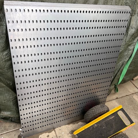 Perforeret metalværkstedsplade i sølvfarvet metal. Pladen har et tæt mønster af huller, som gør det muligt at montere kroge, holdere eller andre ophæng til værktøj og tilbehør. Velegnet til værksted, garage eller hobbyrum til overskuelig opbevaring på væggen. Leveres med tilhørende metalskinner som kan bruges til montering eller ophæng, jf. billedet.