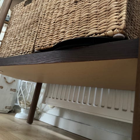 Perfekt til stuen, sommerhuset, udestuen eller som en hyggelig læsekrog. Den varme træfarve og det mørke flet passer godt ind i både moderne og boheme-inspireret indretning.