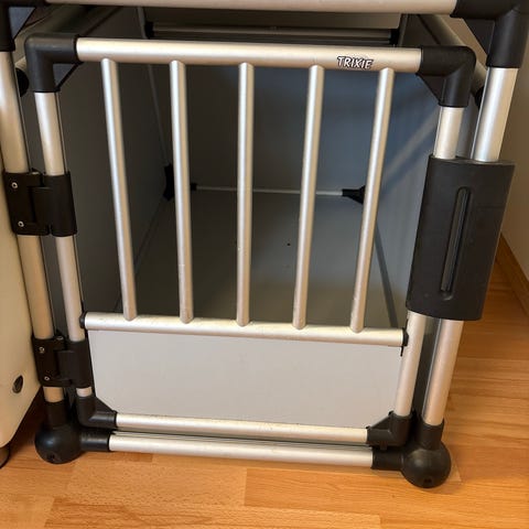 Trixie transportboks til hund i hård plast i grå nuancer. Boksen har metalgitterdør foran med sikkerhedslås og ventilationsåbninger i siderne. På toppen er der bærehåndtag og udtrækkeligt træk-håndtag, så boksen kan håndteres lettere. Egnet til transport af mellemstore hunde, fx i bil eller på rejser, hvor der kræves en lukket og stabil transportløsning. Hundebur
