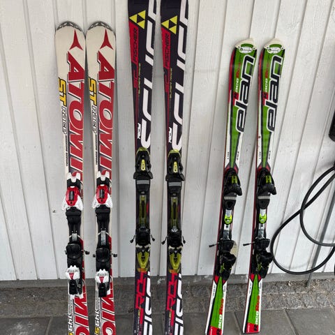 Atomic Race 5 ski i rød og hvid med monterede bindinger. Undersiden fremstår med sort belægning. Modellen har integrerede skibindinger, som kan justeres til passende støvlelængde.