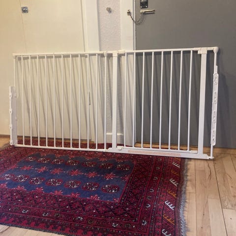 Hvidt sikkerhedsgitter til montering i døråbning. Gitteret er fremstillet i metal og spændes fast mellem karmene uden behov for skruer i væggen. Lågen kan åbnes, så passage gennem døråbningen er mulig uden at fjerne hele gitteret. Egnet til afskærmning af mindre børn eller kæledyr mellem to rum i boligen.