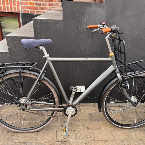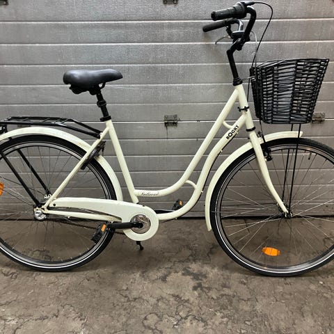 hybridcykel til herre med stelstørrelse L og 28"/700c hjul. Velegnet til daglig transport og pendling i byen på grund af den oprejste kørestilling og de store hjul, som giver stabil kørsel. Farven er sort. Det eneste er at den er låst
