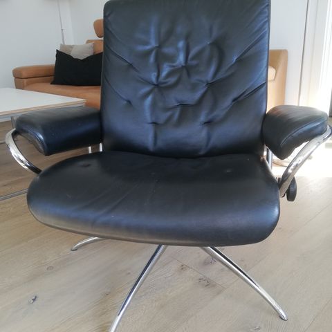 Stressless View sæddebredde 51 cm. fodskammel følger med, fra røgfrit miljø da den ikke bliver brugt, den er i pæn stand. Ny Fast pris 5000 kr. nu 4500 kr. nu 4000 kr. afhentes i stueetage. Fri Mig for bud. 23303900