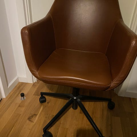 Lækker Wagner læder Kontorstol i virkelig god kvalitet, den virker perfekt og er super god at sidde i, den har desværre fået nogen små skrammer bagpå i flytning :( men det har ingen betydning for stolen udover kosmetisk, og de kan nemt dækkes hvis man skulle ønske det så man ikke kan se dem! de kan ses på sidste billede. Det kun derfor den sælges så billigt, du får ikke en stol i den kvalitet til en bedre pris :) den skal hentes i næstved