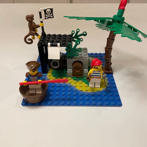 LEGO pirat ø sæt med baseplate, palme, skattekiste, kanon og mindre båd. Sættet indeholder flere minifigurer med pirattema samt tilbehør som flag, abe og diverse små dele. Egnet til leg og opbygning af piratmiljø på en lille ø-scene.