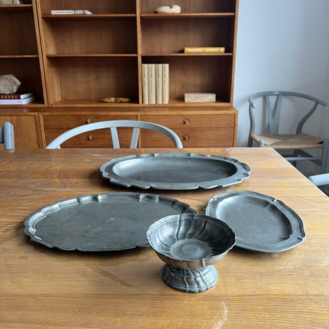 Fire fine 17/1800-tals genstande med lysestage, kande, skål og terrin.