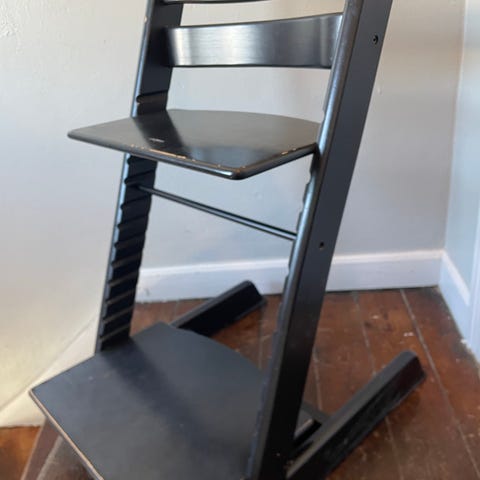Sælger en flot og velholdt Tripp Trapp højstol fra Stokke i klassisk sort. En tidløs og ergonomisk stol, der vokser med barnet og kan bruges fra baby til voksen.