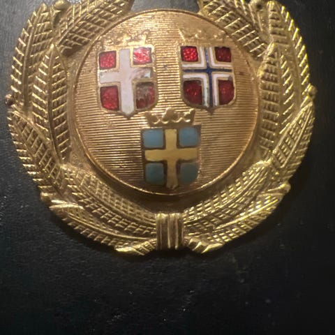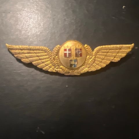 SAS emblembadge i metal med motiv af nordiske flag. Emblemet har en rund midterdel med skjolde i farverne rød, hvid, blå og gul, omgivet af en krans med kornaks. Bagsiden har fastgørelsesbeslag til montering på f.eks. uniform, kasket