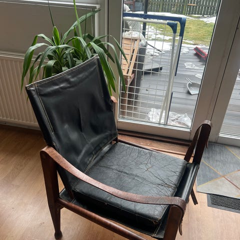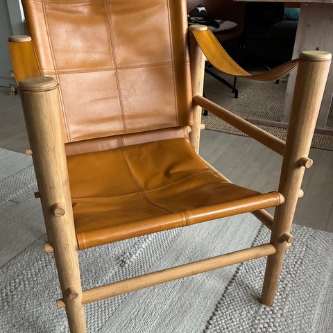 Wilhelm Kienzle lænestol Safari Chair. Tegnet 1928. Trækonstruktion der kan skilles ad, beklædning og armlæn i brunt smukt patineret skind. 88x55x60 cm